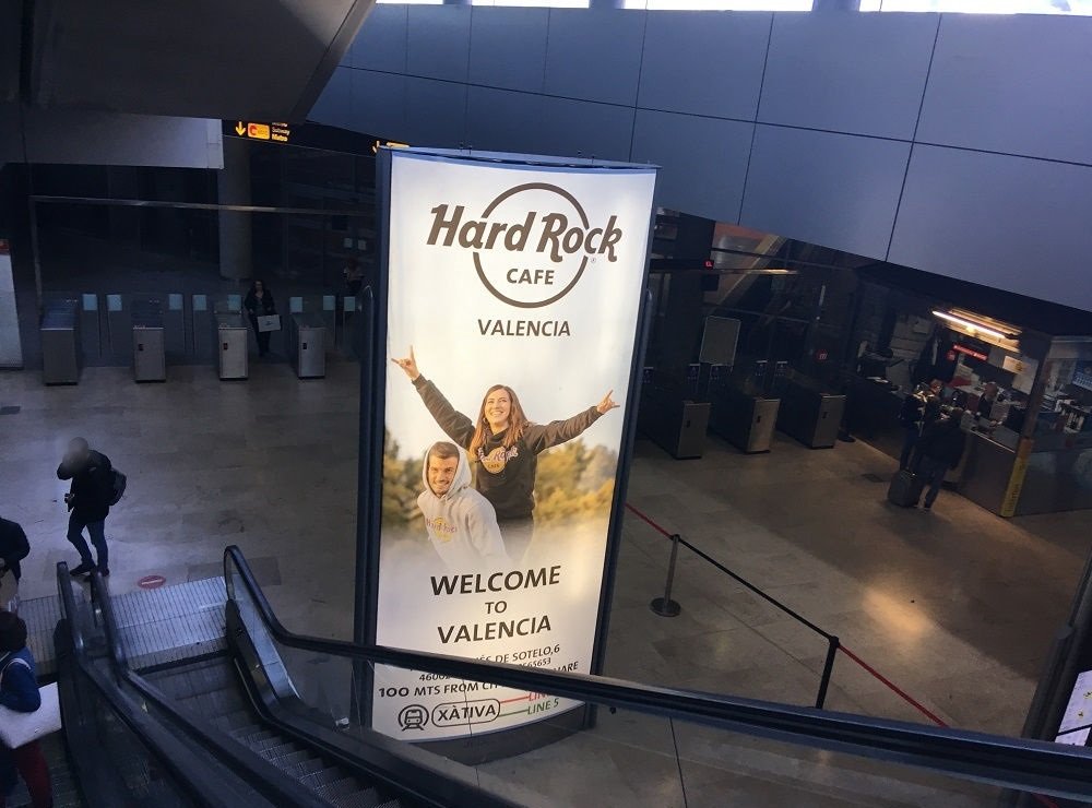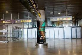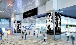 Muebles urbanos para información publicitaria (MUPIs) ubicados en áreas peatonales dentro del aeropuerto, como pasillos y zonas comerciales.